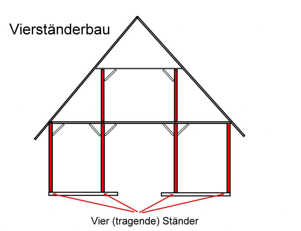 Die Hauskonstruktion ruht auf vier Ständern. Diese gehen von der Schwelle bis zum Dach durch und bilden gleichzeitig die Seitenwände. Sie sind das tragende System dieser Holzkonstruktion. Die beiden langen Ständer in der Mitte ermöglichen die stattliche Größe mit zwei Etagen.